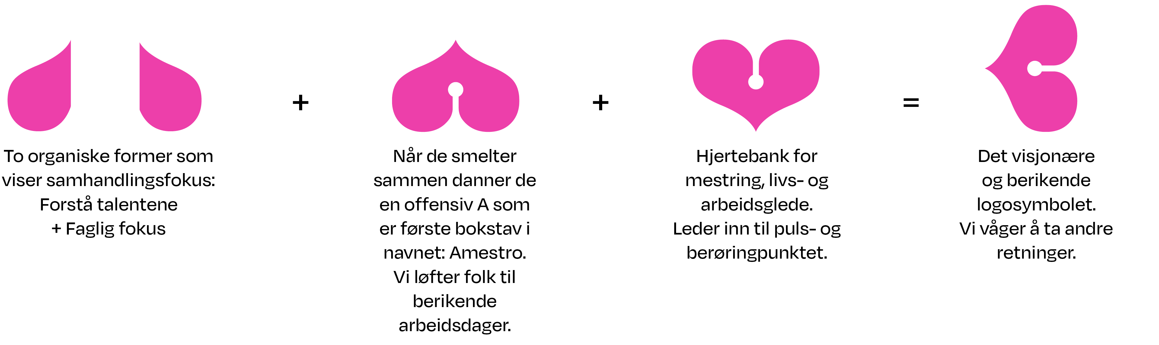Logosymbolet er en abstrakte A som er første bokstav i navnet Amestro. Vi har snudd den og gitt den ei pilform. Det viser at vi er visjonære og våger å ta andre veier og retninger. Vi kan også se et hjerte med et pulspunkt og en pulstrek. Det viser at vi skal skape livsglede, mestring og berikende arbeidsdager for flest mulig mennesker.