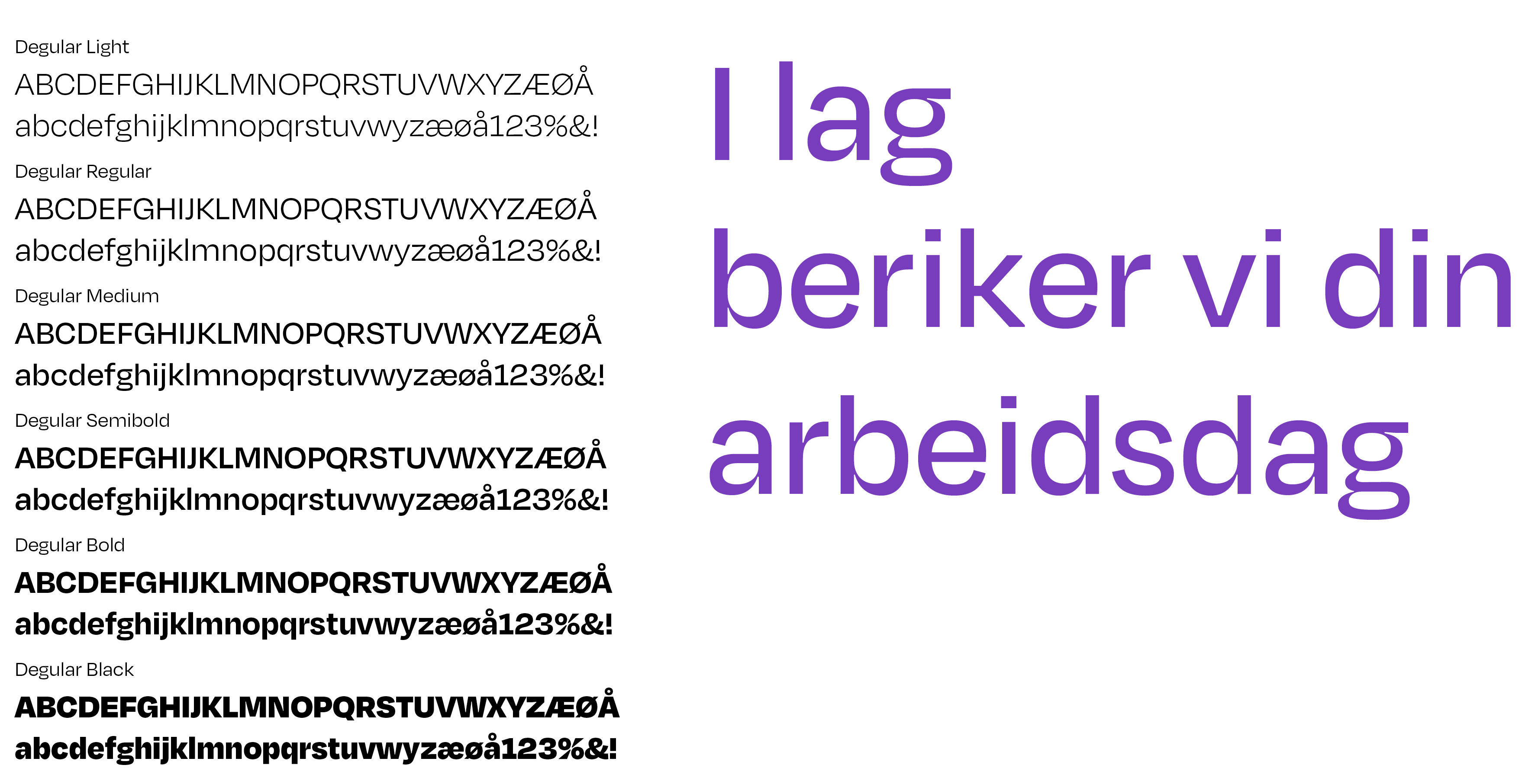 På brødtekst brukes Degular Regular. Uthevelser på brødtekst gjøres med Degular Medium eller Degular Regular Italic